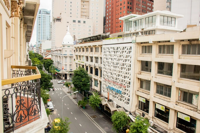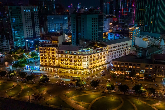 Majestic ligger ved Saigonelven langs dagens Dong Khoi, som under fransk tid bar navnet Rue Catinat. Gaten var da byens paradegate, kantet av kafeer, hoteller og eksklusive butikker. I dag er Dong Khoi fortsatt Saigons mest klassiske boulevard – en livlig akse mellom elven og operahuset, der historie og moderne byliv møtes side om side.